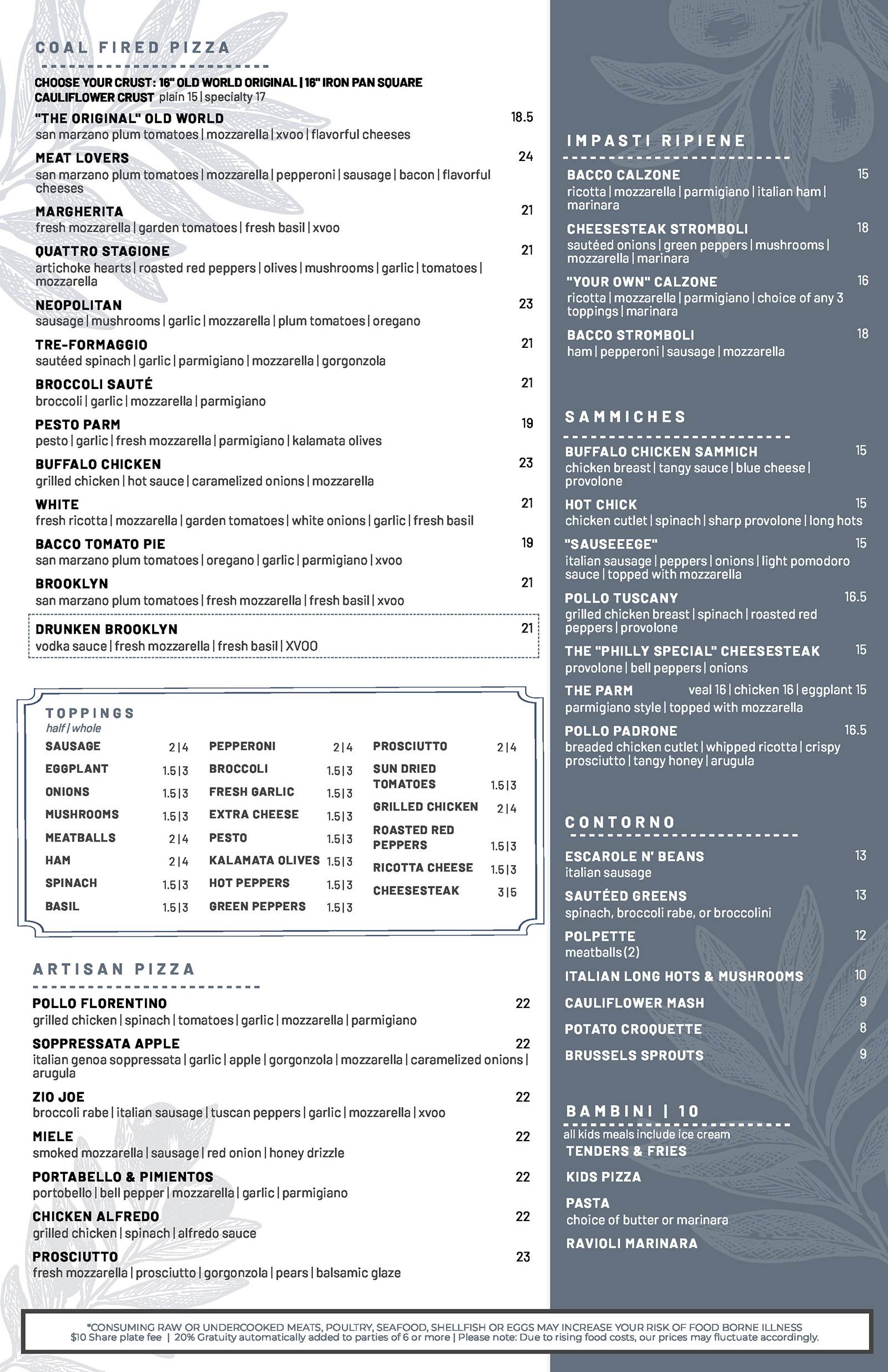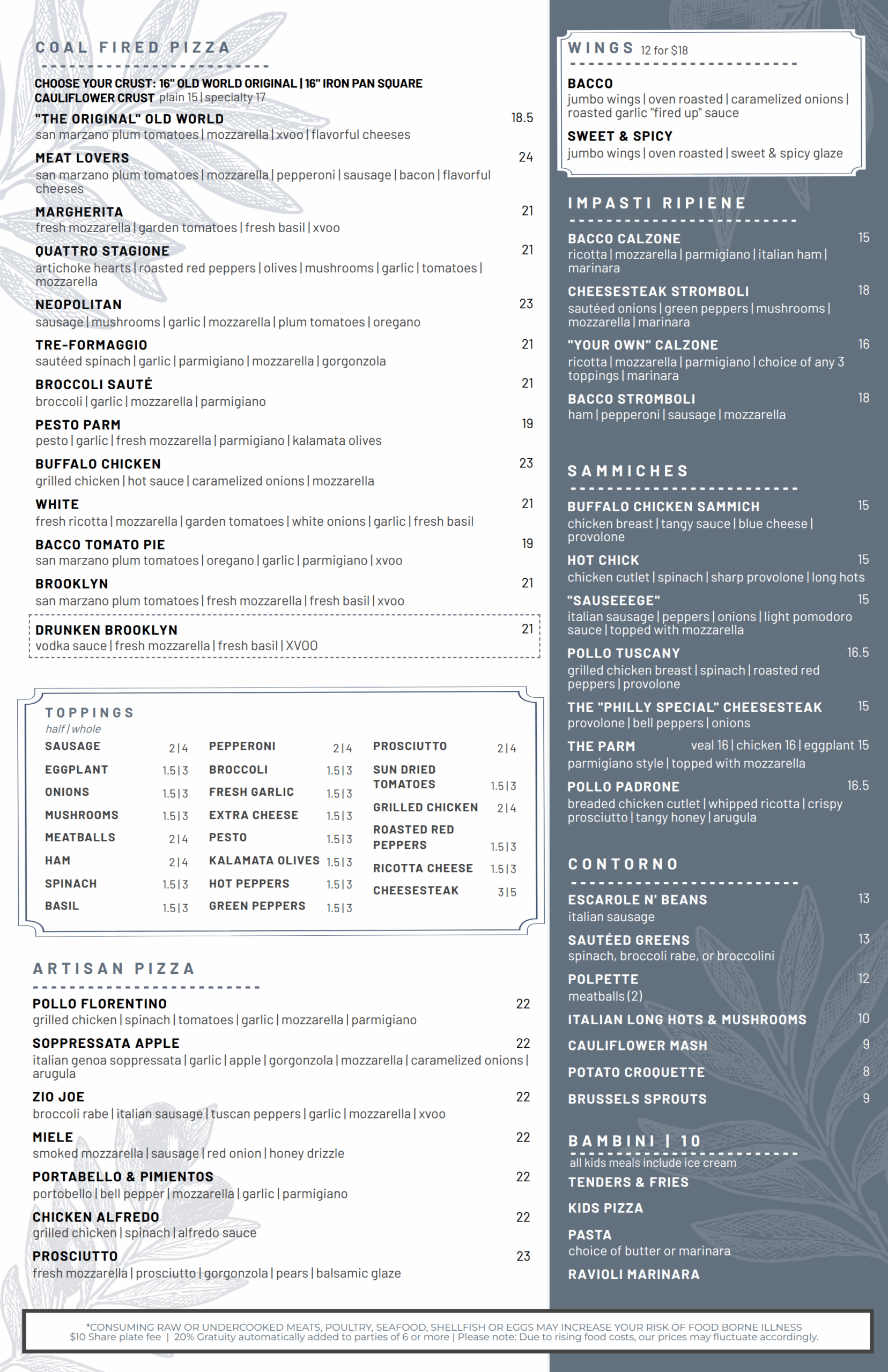 *Consuming raw or undercooked meats, poultry, seafood, shellfish, or eggs may increase your risk of foodborne illness. $10 share plate fee | 20% gratuity automatically added to parties of 6 or more